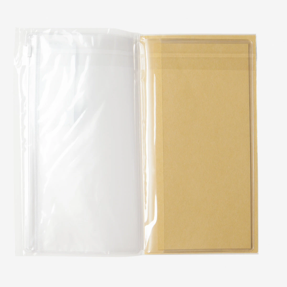 21 × 22,3 cm, 1 Ziplock-Tasche und 2 Einschubtaschen, aus PVC. Made in Japan.