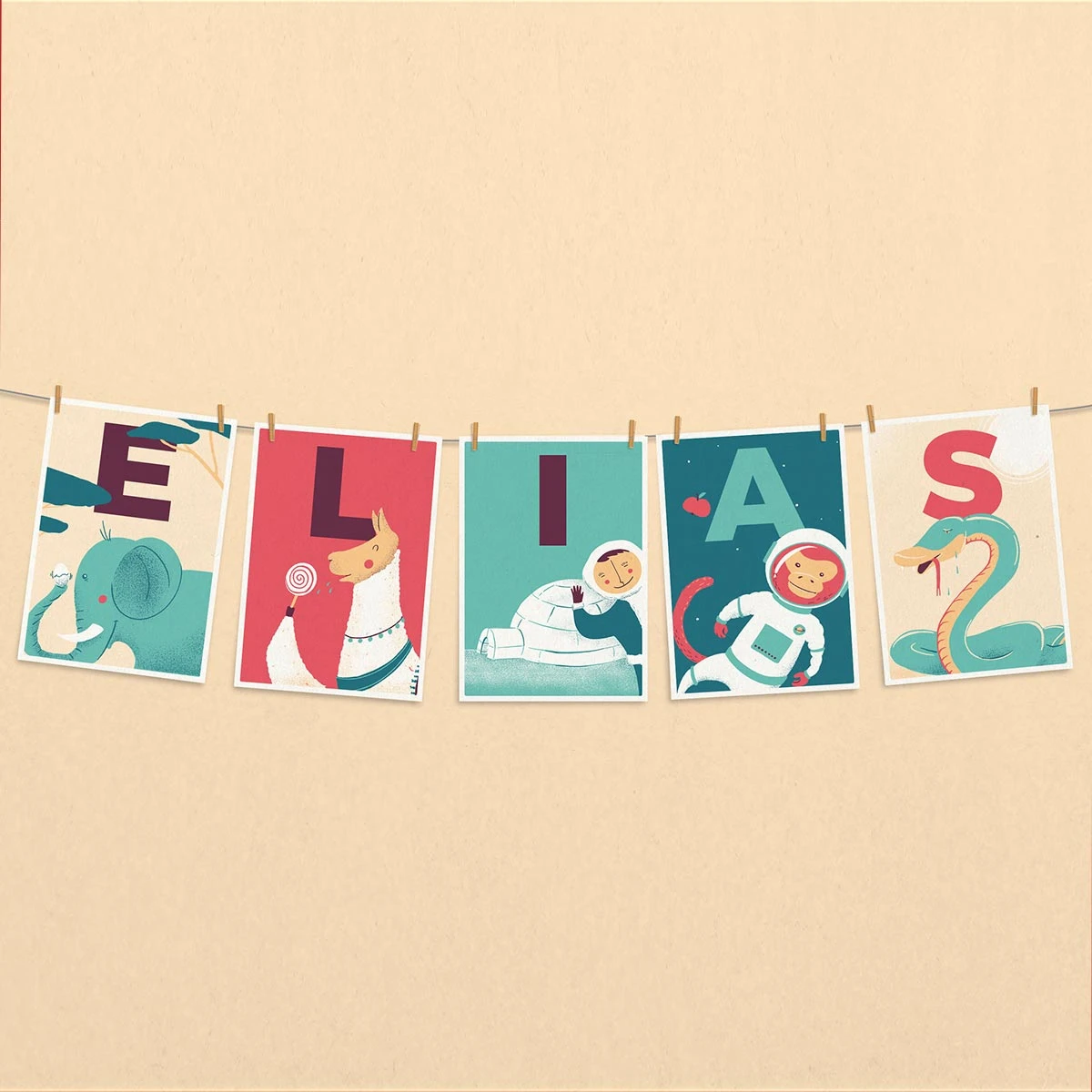 Eine Lernhilfe für die Kleinen, als Geschenkanhänger, für eine Namens-Girlande, oder als Karte zur Geburt. Alle Illustrationen sind so ausgesucht, dass sie sowohl auf Deutsch als auch auf Englisch funktionieren.