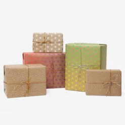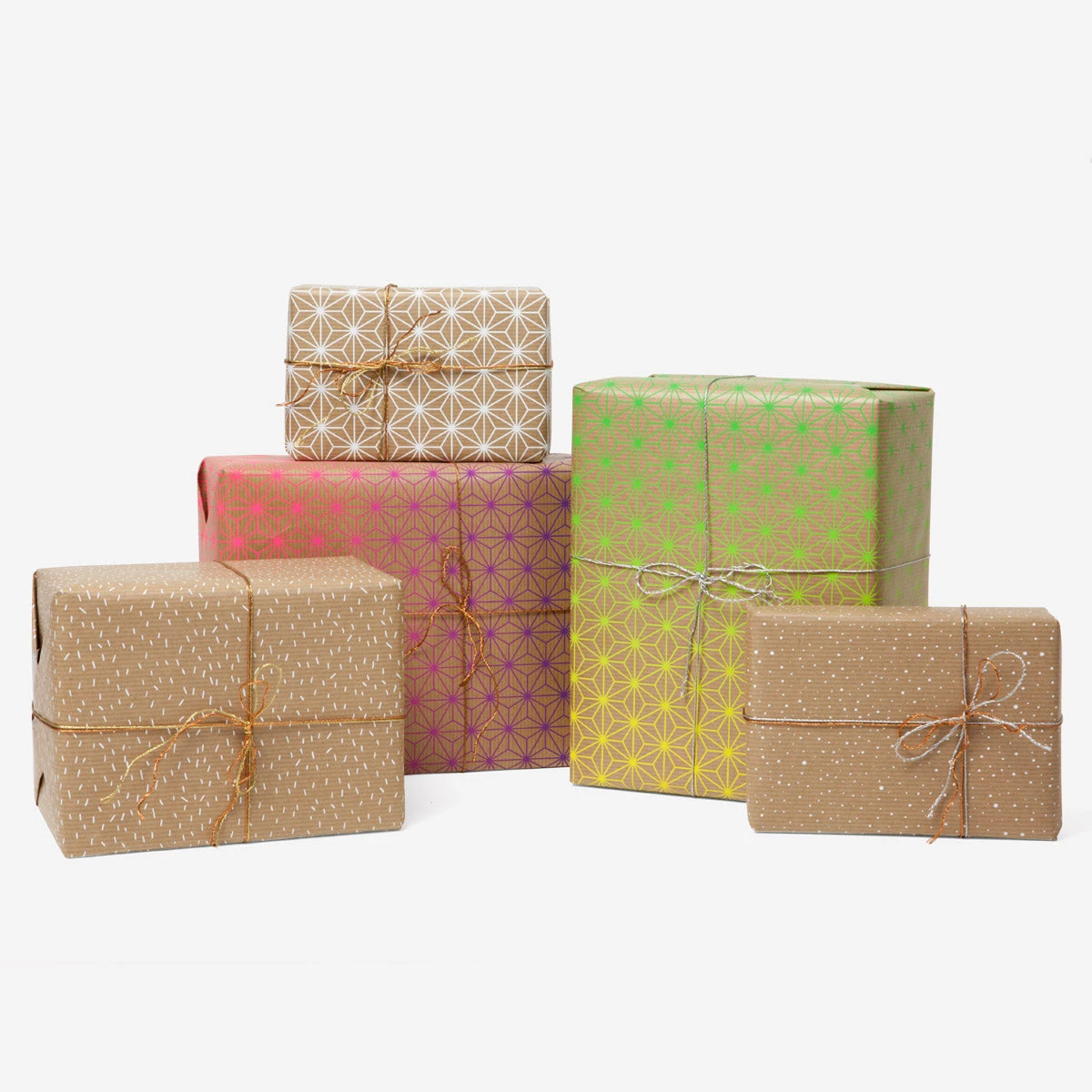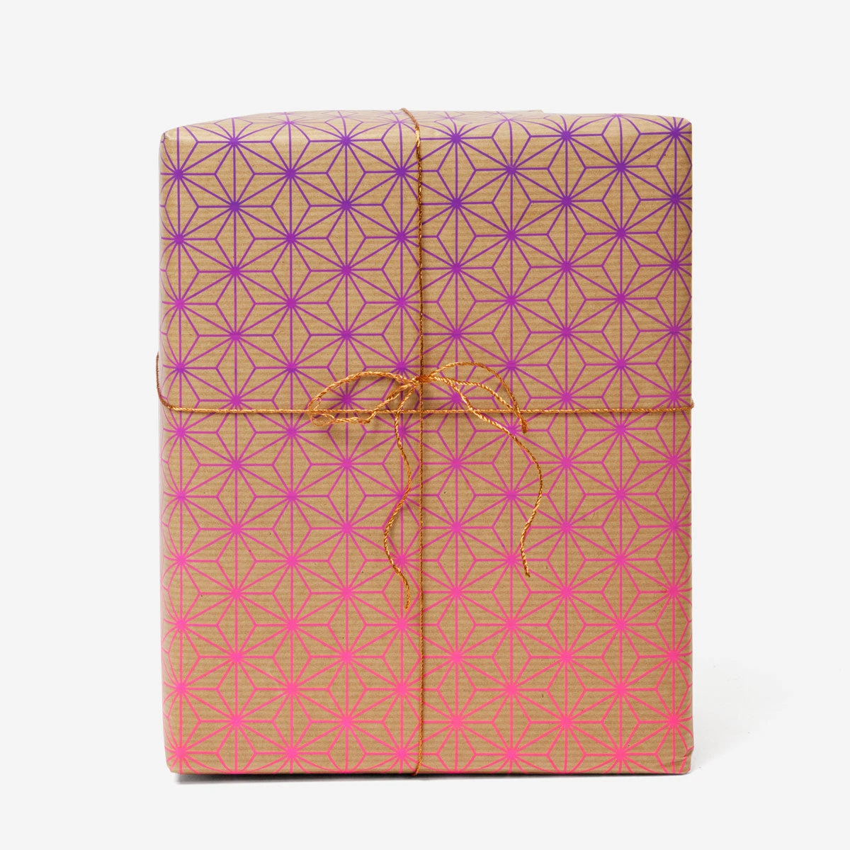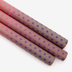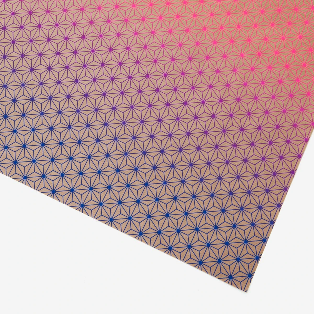 Traditionelles japanisches Asanoha-Muster trifft als Siebdruck in wahnsinnig schönem neonpink-zu-blauem Farbverlauf auf unprätentiöses braunes Packpapier. Ein Bogen ist ca 50 × 70 cm groß.