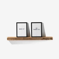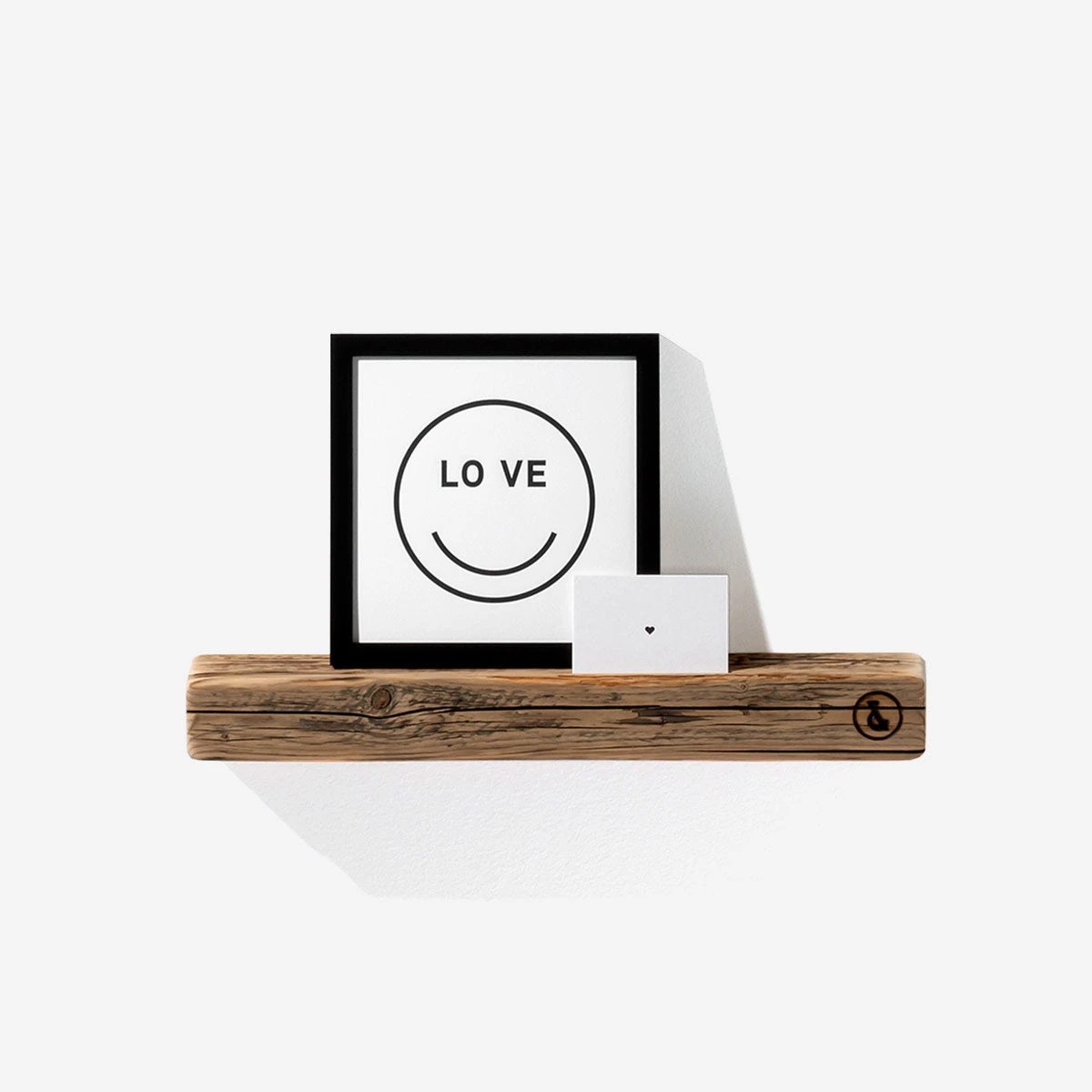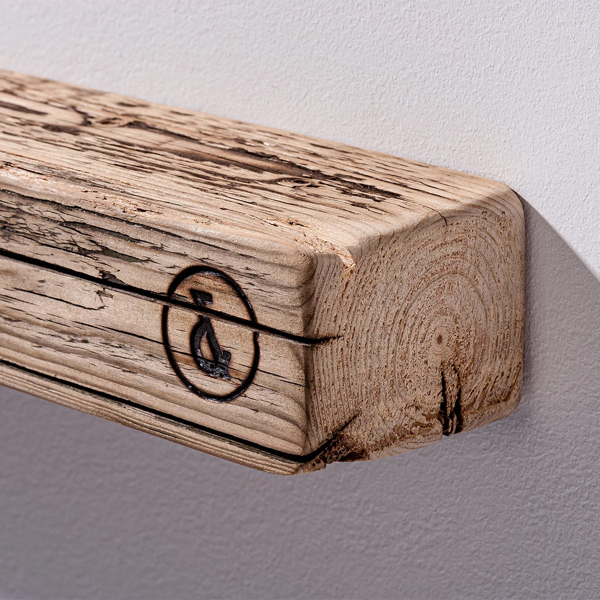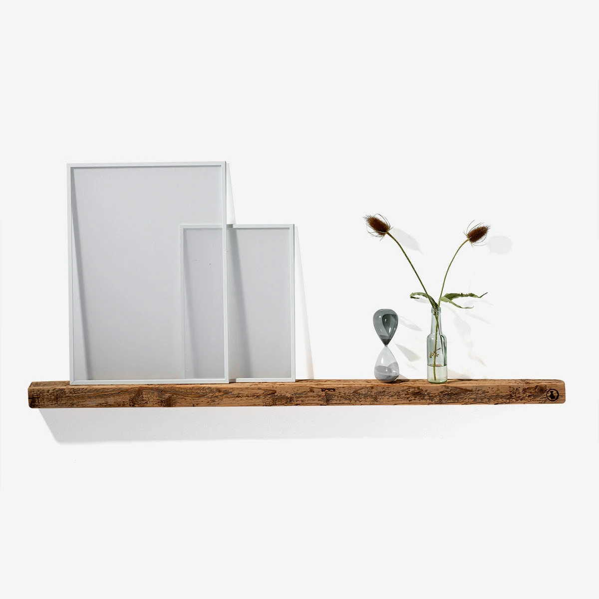 Die Bilderleiste Altholz 02 ist in drei Größen erhältlich: S (50 × 7,5 × 4 cm), M (100 × 7,5 × 4 cm) und L (150 × 7,5 × 4 cm). Sie wird mit zwei Schrauben an der Wand befestigt.