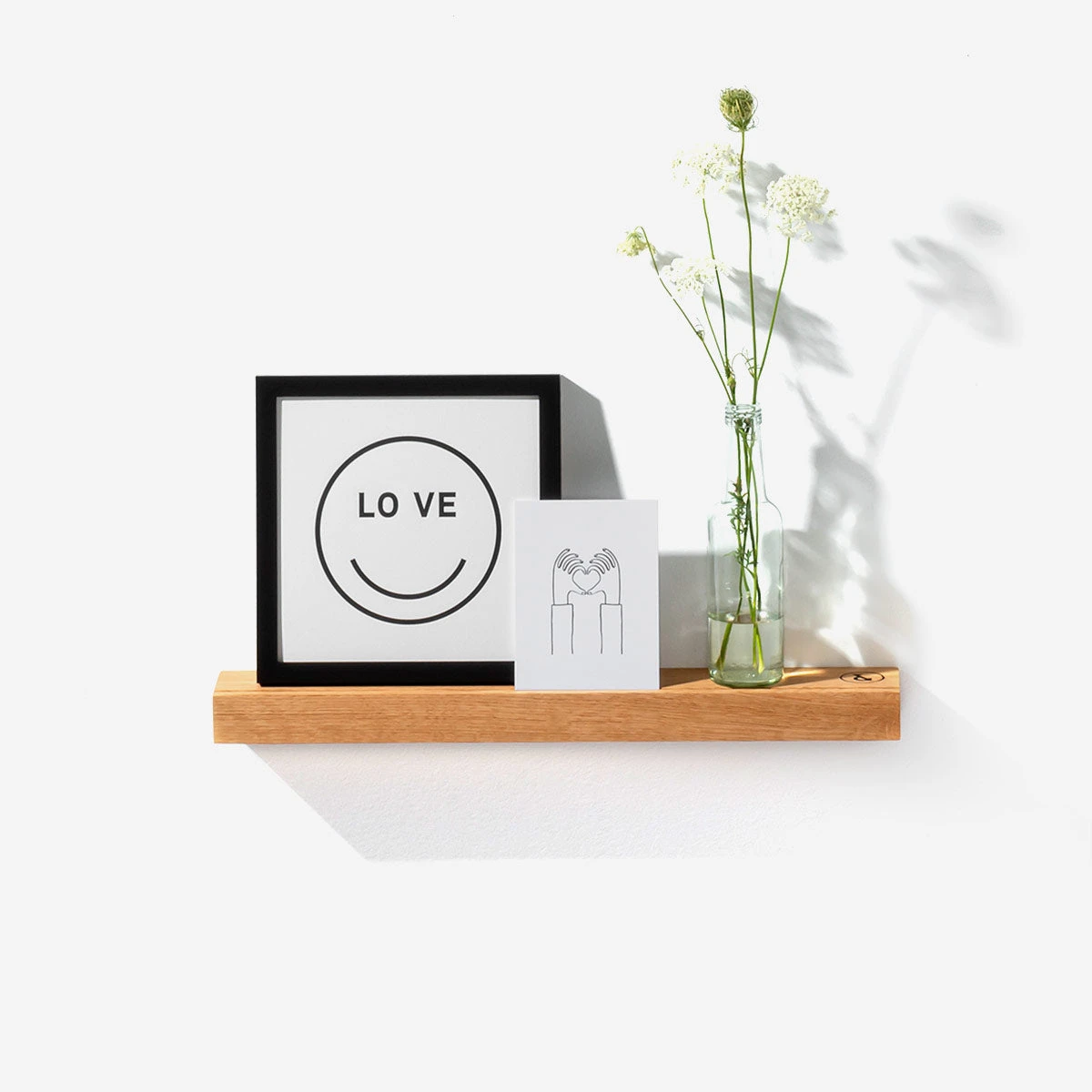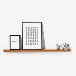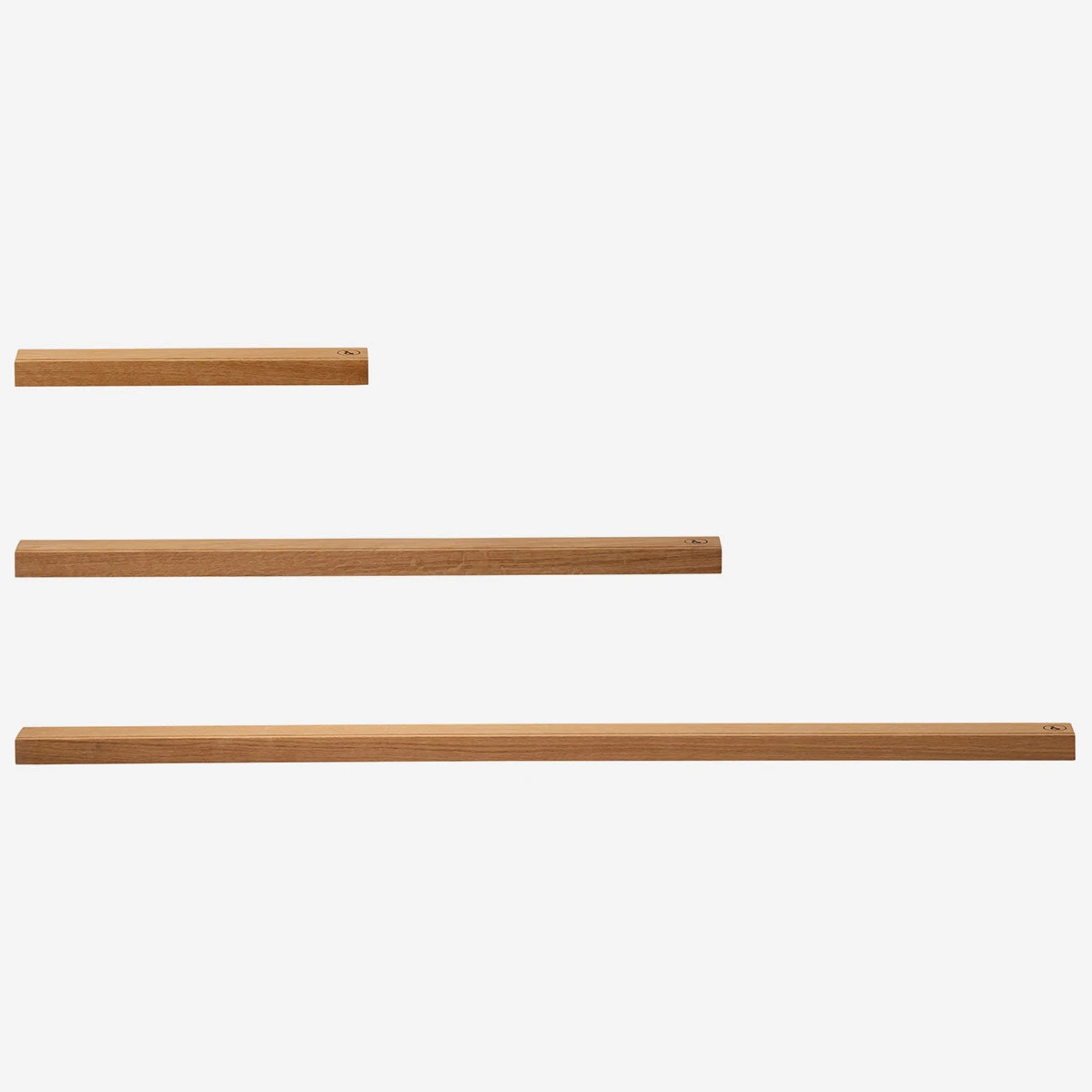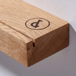 Die Bilderleiste Eiche 02 ist in drei Größen erhältlich: S (50 × 7,5 × 4 cm), M (100 × 7,5 × 4 cm) und L (150 × 7,5 × 4 cm). Sie wird mit zwei Schrauben an der Wand befestigt.