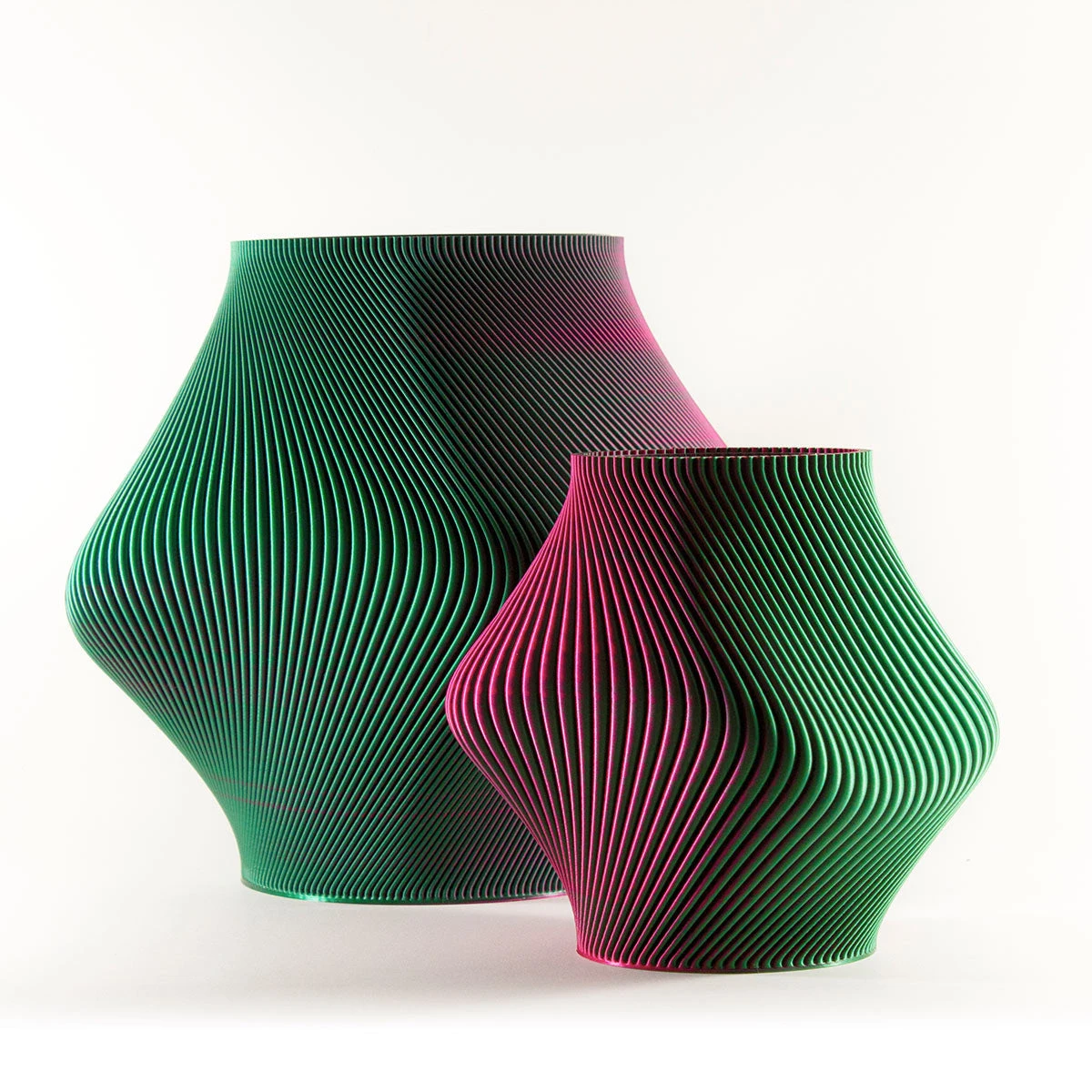 Die Vasen von Sheyn. aus Wien mit ihren spannenden Texturen und ausgewogenen, interessanten Formen werden im 3D-Druck hergestellt. Die Vasen sind innen mit einem genau passenden, herausnehmbaren Glas bestückt, in das du das Wasser einfüllen kannst. Ein weiteres Plus: das verwendete Material auf der Basis von Mais ist nachhaltig und recycelbar.