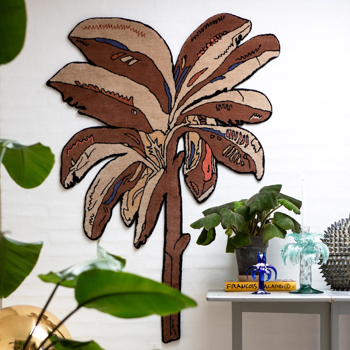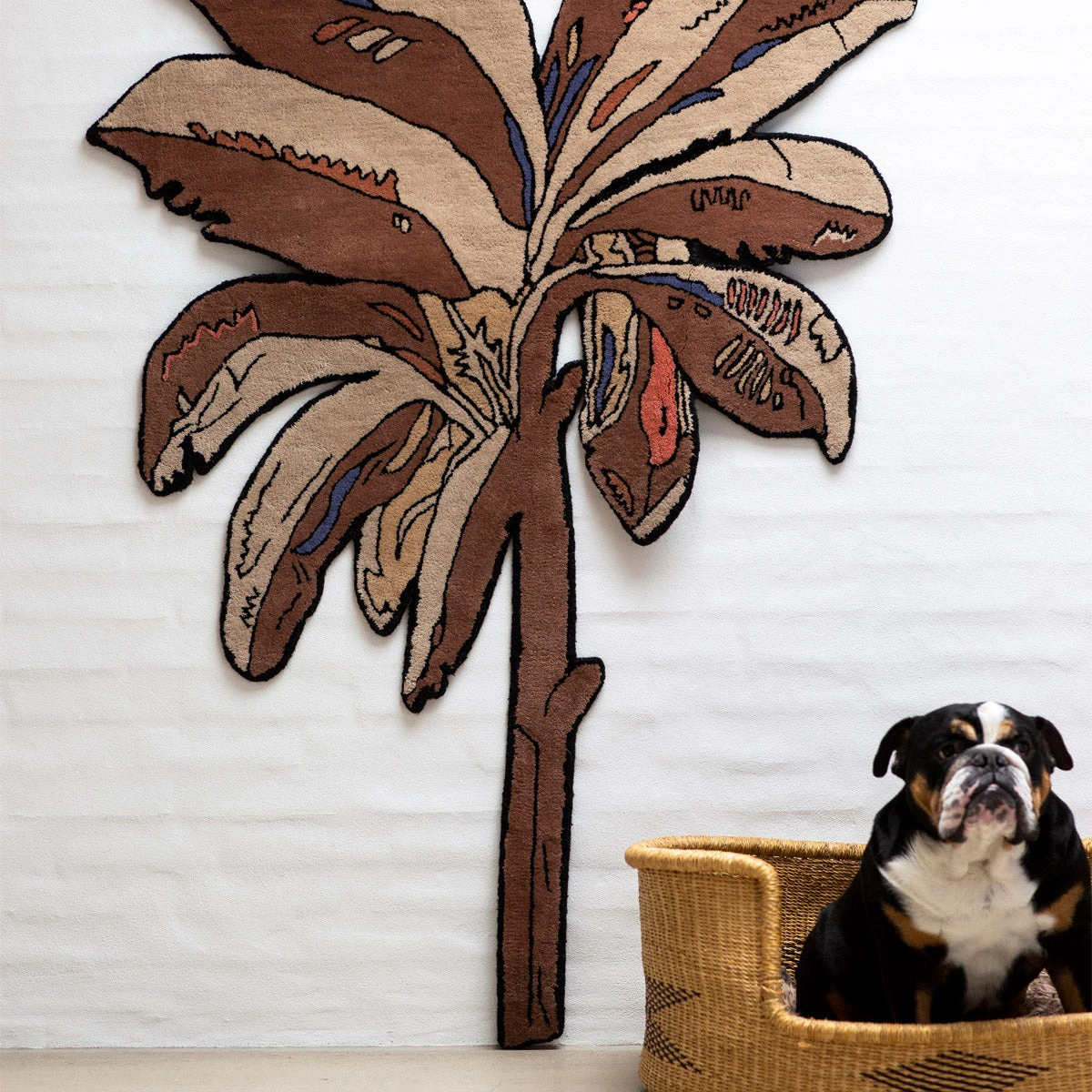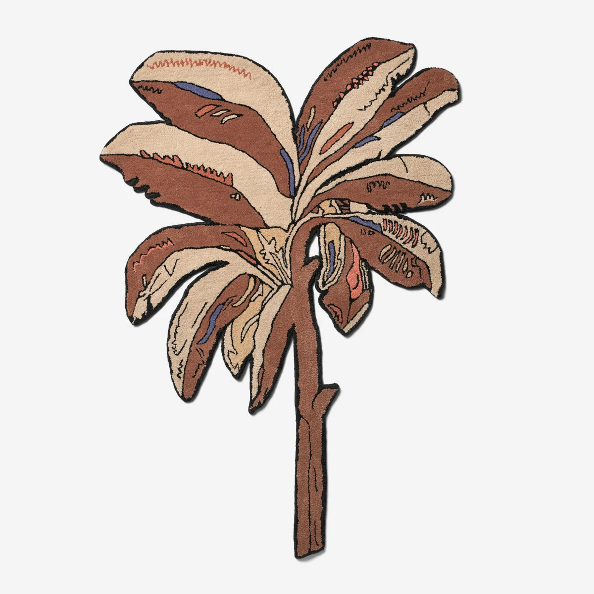 Der Bounty Rug bringt eine Palme in den Raum – aber ohne Postkartenkitsch. Das verspielte, zugleich grafisch elegante Motiv trifft auf eine harmonische Farbpalette aus Braun, Elfenbein, Koralle und einem Hauch Himmelblau. Ein Teppich, der Leichtigkeit ausstrahlt und dabei formstark bleibt.