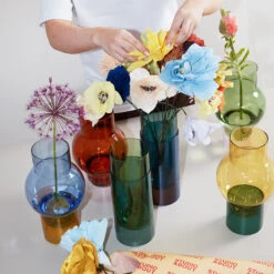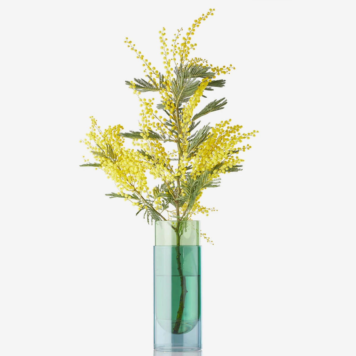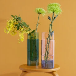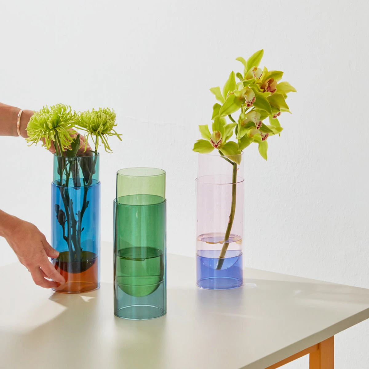 Die Bouquet Tube Vase von Studio About spielt mit Dimensionen und Farben und zieht mit ihrem ungewöhnlichen Design die Blicke auf sich. Sie besteht aus drei Glaselementen in unterschiedlichen Farben, die mit ihrer Kombination der Vase eine besondere Tiefe und Lebendigkeit verleihen.