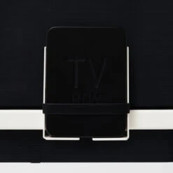 Der Box Mount wird einfach auf der Rückseite des TV-Ständers hinter dem Bildschirm angebracht. Sie besteht aus zwei gewinkelten Haltebügeln, die das Gerät zwischen sich einklemmen, und sicheren Klettbändern, die für einen festen Halt sorgen.