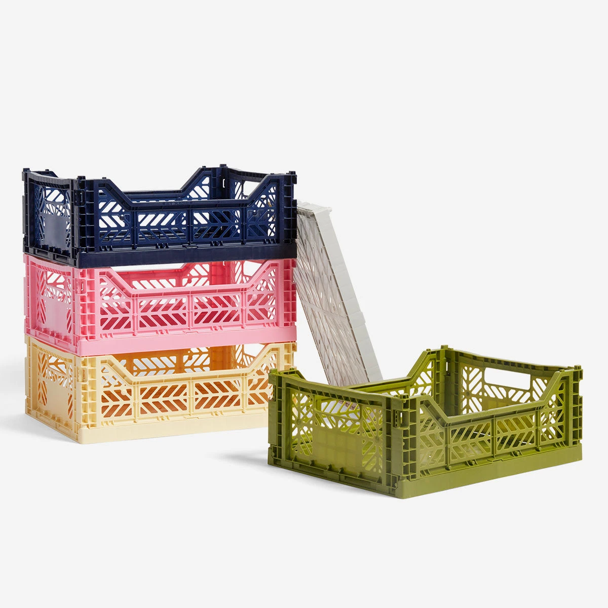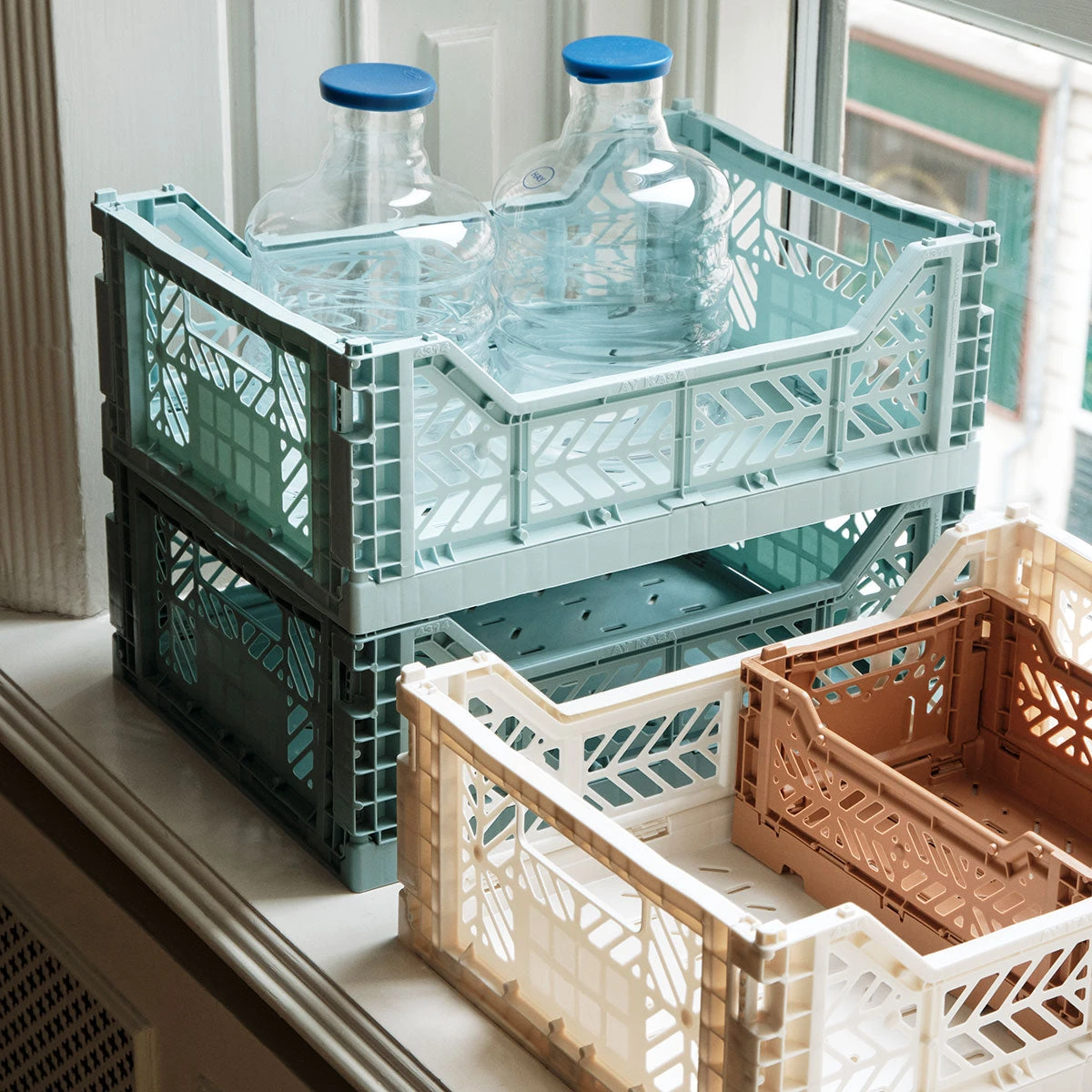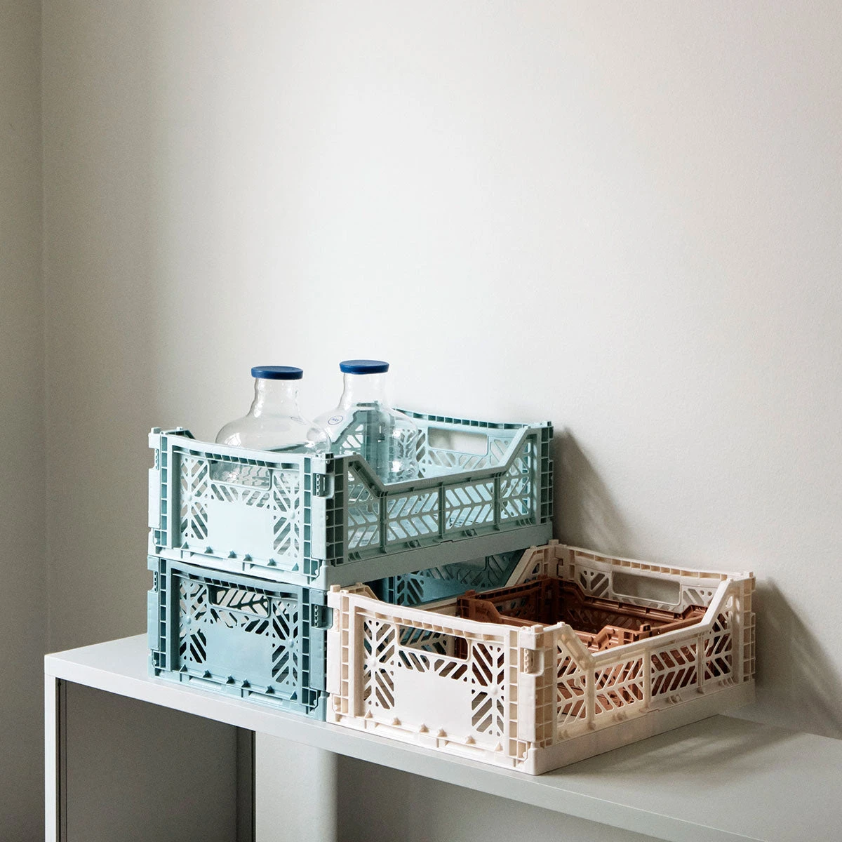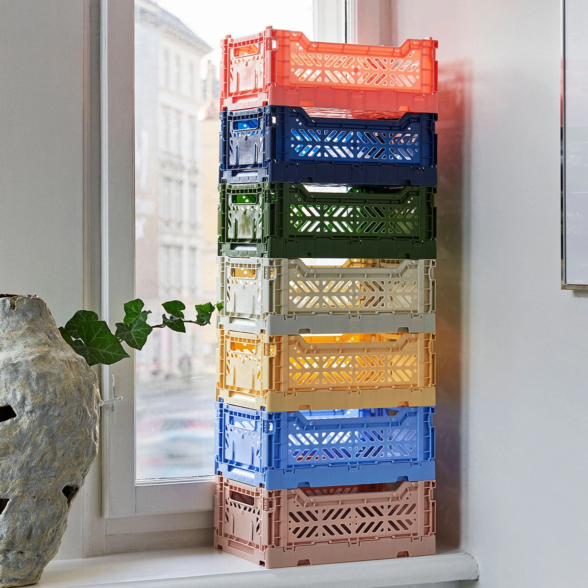 Es gibt die Crates in verschiedenen Größen und in einer Vielzahl von bunten Tönen, die sich zu wunderschönen Farbpaletten kombinieren lassen. Alle Klappboxen (auch unterschiedlicher Marken) sind stapelbar.