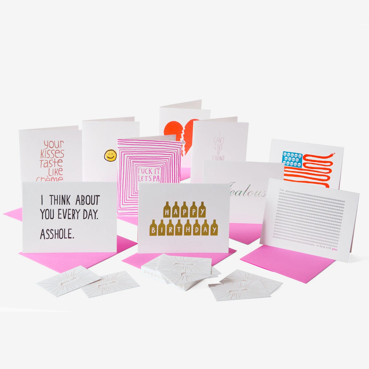 Die Designs werden allesamt mit hochwertigen Drucktechniken wie Letterpress und / oder Heissfolienprägung umgesetzt und kommen mit dem pinken Ashkahn Signature Briefumschlag.