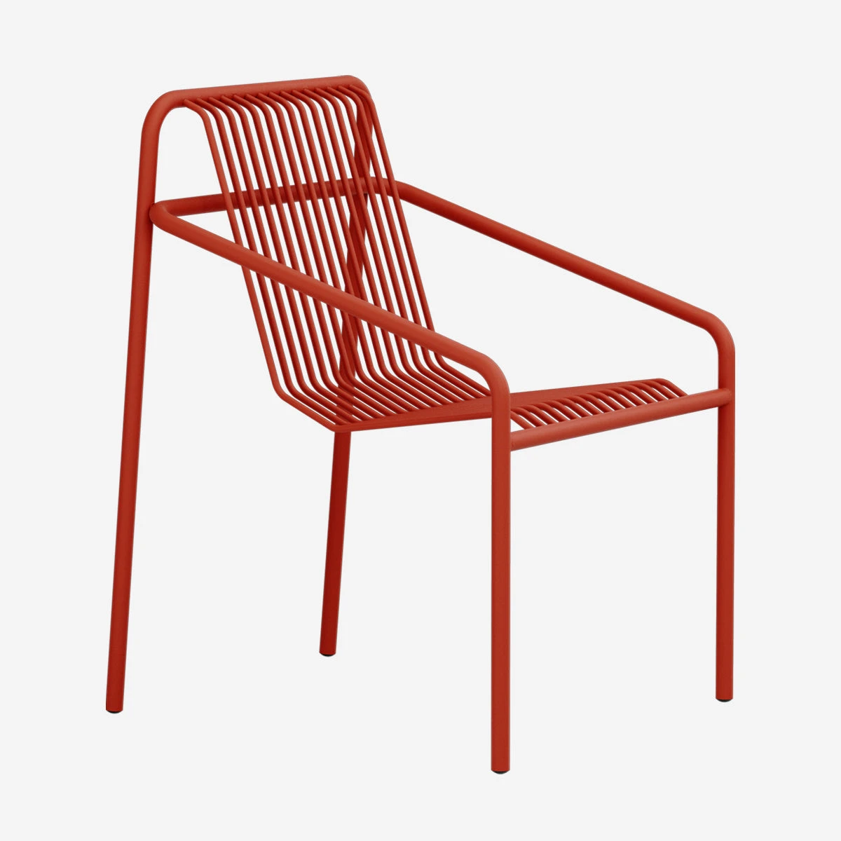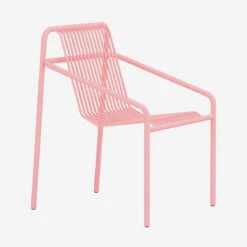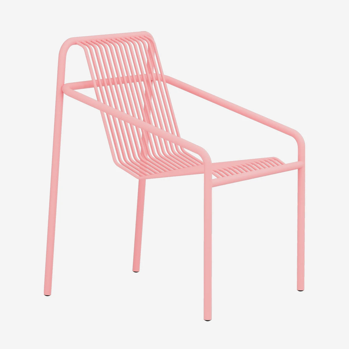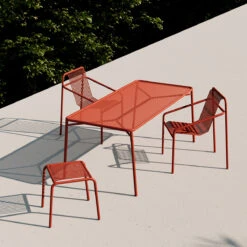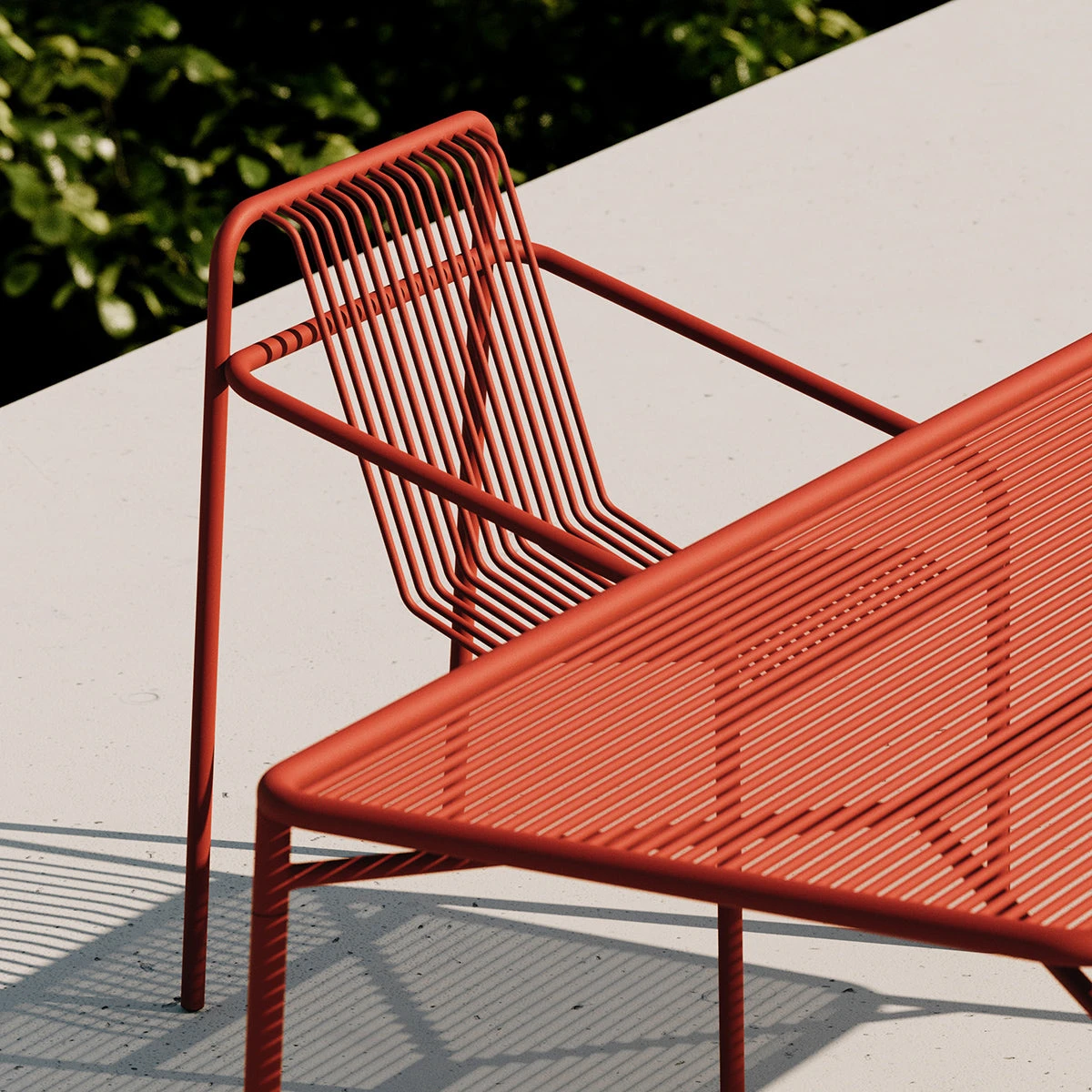 Zwischen Tisch und Sitzmöbeln entsteht ein Wechselspiel aus Transparenz und Materialdichte, das in der Sonne ein fantasievolles Farbspektrum erzeugt. Silbernes Besteck funkelt sanft im Licht, während eine Wasserperle auf dem Glas ihren Weg zum Tisch sucht. Dort trifft sie auf die Farben der Kollektion: Sienna Red und Soft Pink. Sie entwickeln eine besondere Ästhetik wenn sie mit dem Grün der Natur oder der städtischen Architektur interagieren. Sie sind eine Befreiung von den Zwängen des Interieurs, wo wir immer nach Bezügen zu anderen Farben suchen müssen. Draußen sind sie frei.