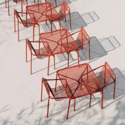 Zwischen Tisch und Sitzmöbeln entsteht ein Wechselspiel aus Transparenz und Materialdichte, das in der Sonne ein fantasievolles Farbspektrum erzeugt. Silbernes Besteck funkelt sanft im Licht, während eine Wasserperle auf dem Glas ihren Weg zum Tisch sucht. Dort trifft sie auf die Farben der Kollektion: Sienna Red und Soft Pink. Sie entwickeln eine besondere Ästhetik wenn sie mit dem Grün der Natur oder der städtischen Architektur interagieren. Sie sind eine Befreiung von den Zwängen des Interieurs, wo wir immer nach Bezügen zu anderen Farben suchen müssen. Draußen sind sie frei.
