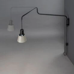 Die K830 ist eine funktional einzigartige Leuchte aus den frühen 1930er Jahren. Die frei schwenkbaren Arme der Wandleuchte ermöglichen ein völlig flexibles Ausrichten. Auch der Lampenschirm lässt sich ganz frei bewegen und verstellen, so dass man das Licht sehr gezielt setzen kann. Eine weitere Besonderheit ist die stufenlose Höhenverstellung des Lampenschirms: das Stromkabel gleitet frei im Rohr und wird mit einem Gegengewicht zum Leuchtenkopf ausbalanciert.