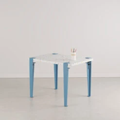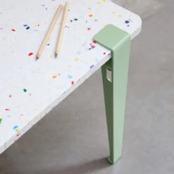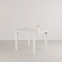 Die Tischplatte des Tutti Frutti Tisches besteht aus recyceltem Plastik – aus alten Kinderspielzeugen! Der Name Tutti Frutti bezieht sich auf die kunterbunten Farbstipsen, mit denen die Tischplatte deswegen durchzogen ist.