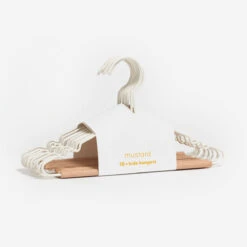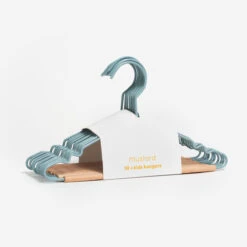 Die bunten, matt pulverbeschichteten Hanger sind in allen Mustard-Farben erhältlich. Sie haben ein Holzdetail und den mustard-Signature-Kringel an den Seiten.