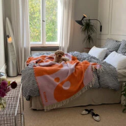 Für gemütliche Stunden zuhause: mit der Klekks No. 8 Orange-Rosa Wolldecke wird dir warm ums Herz und bunt im Wohnzimmer.