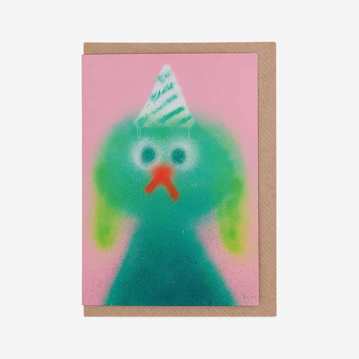 Das Motiv dieser Grußkarte des in New York lebenden Künstlers Jon Burgerman war ursprünglich Teil der Ausstellung „You Met Me at a Very Strange Time in My Life“, die in der Galerie L21 in Spanien gezeigt wurde. Diese Serie zeigt lustige, starre Figuren mit Partyhüten und verspielten Farbpaletten. Die Werke, volle mit Burgermans trockenem Witz und Humor unterstreicht, wurden mit Sprühfarbe angefertigt, die ihnen eine lebendige und strukturierte Ästhetik verleiht.