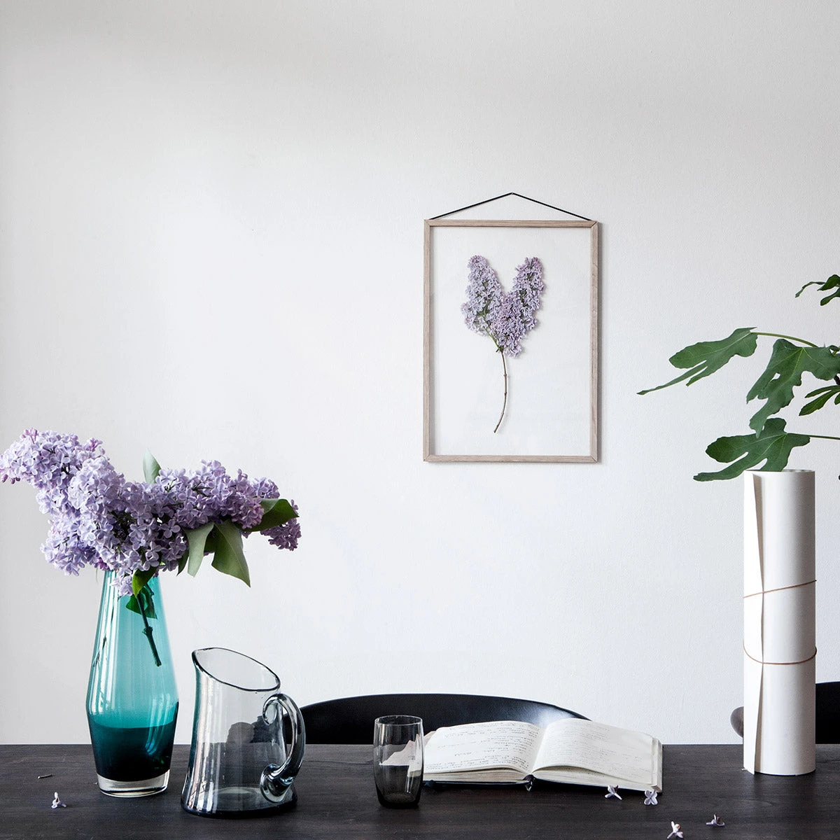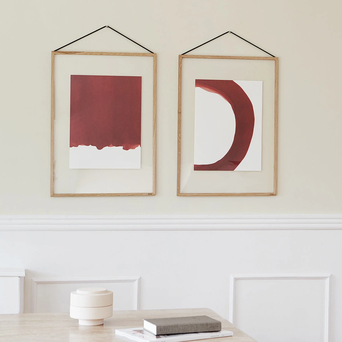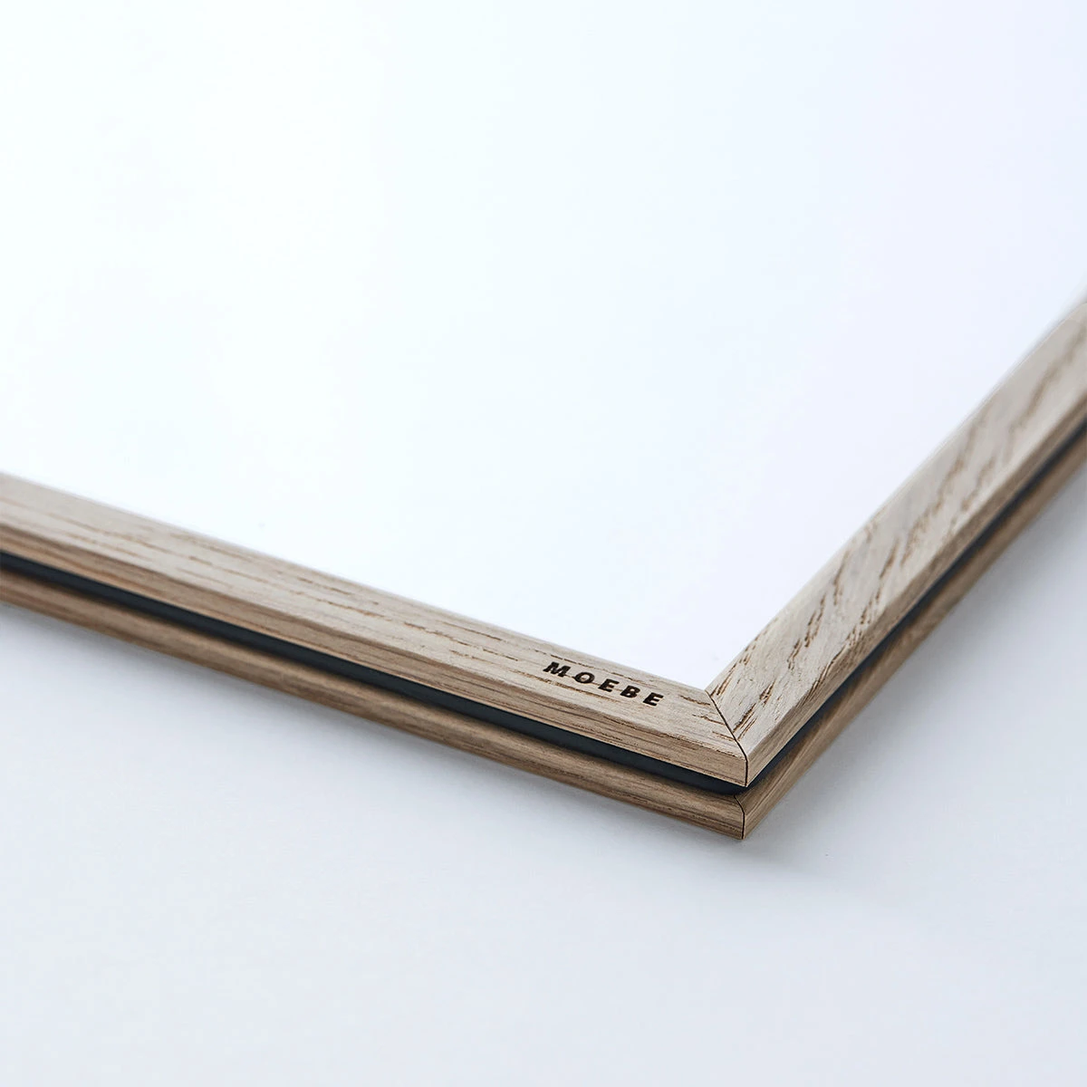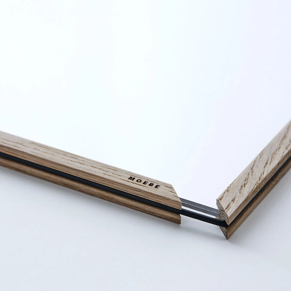 So einfach, so perfekt: Die Frames von Moebe bestehen aus zwei Acrylglasscheiben, vier Leisten und einem Gummiband. Das Gummiband hält den Rahmen zusammen und hängt ihn gleichzeitig an der Wand auf. Dank der einfachen, aber raffinierten Konstruktion kannst du den Rahmen horizontal oder vertikal aufhängen und ihn bei freier Aufhängung sogar von beiden Seiten betrachten.
