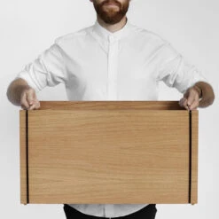 Die beiden Metallrahmen an den Seiten halten die Holzteile zusammen und sind gleichzeitig Tragegriffe. Die Komponenten der Box werden flach verpackt geliefert. Die Storage Box ist leicht zu montieren und bei Bedarf auch leicht wieder auseinander zu nehmen.