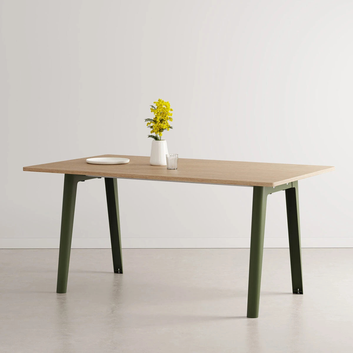 Ein NEW MODERN Tisch besteht aus zwei Tischbeinen aus pulverbeschichtetem Stahl, die mit zwei Streben aus Edelstahl zu einem stabilen Tischgestell verbunden werden. Die größeren Formate bekommen noch eine Querstrebe zur zusätzlichen Stabilität.