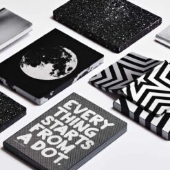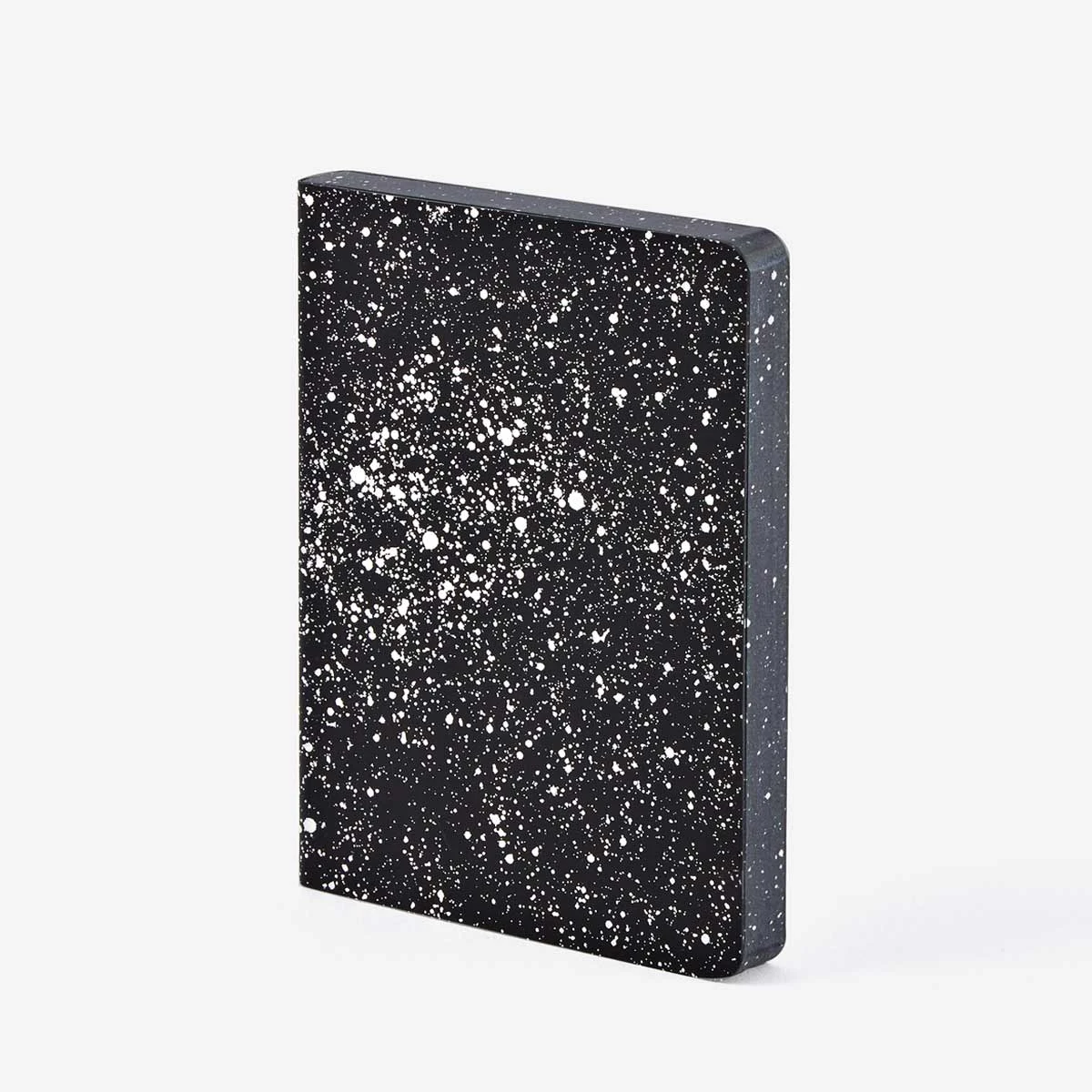 Was ist inspirierender als der Blick in die Sterne? Damit Du auch tagsüber nicht auf diese Inspirationsquelle verzichten musst, hat nuuna sie einfach auf das Notizbuch gedruckt. Das nachtschwarze Cover besteht aus weichem recyceltem Leder und ist silbermatt im Siebdruck bedruckt. Das Buch hat einen Farbschnitt im gleichen Design.