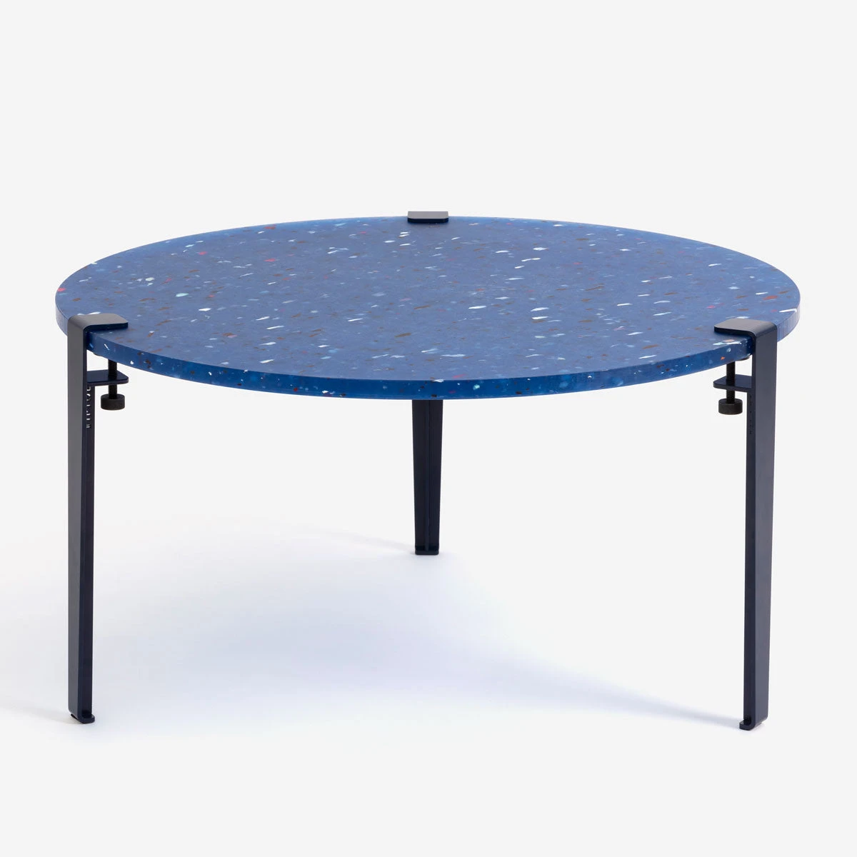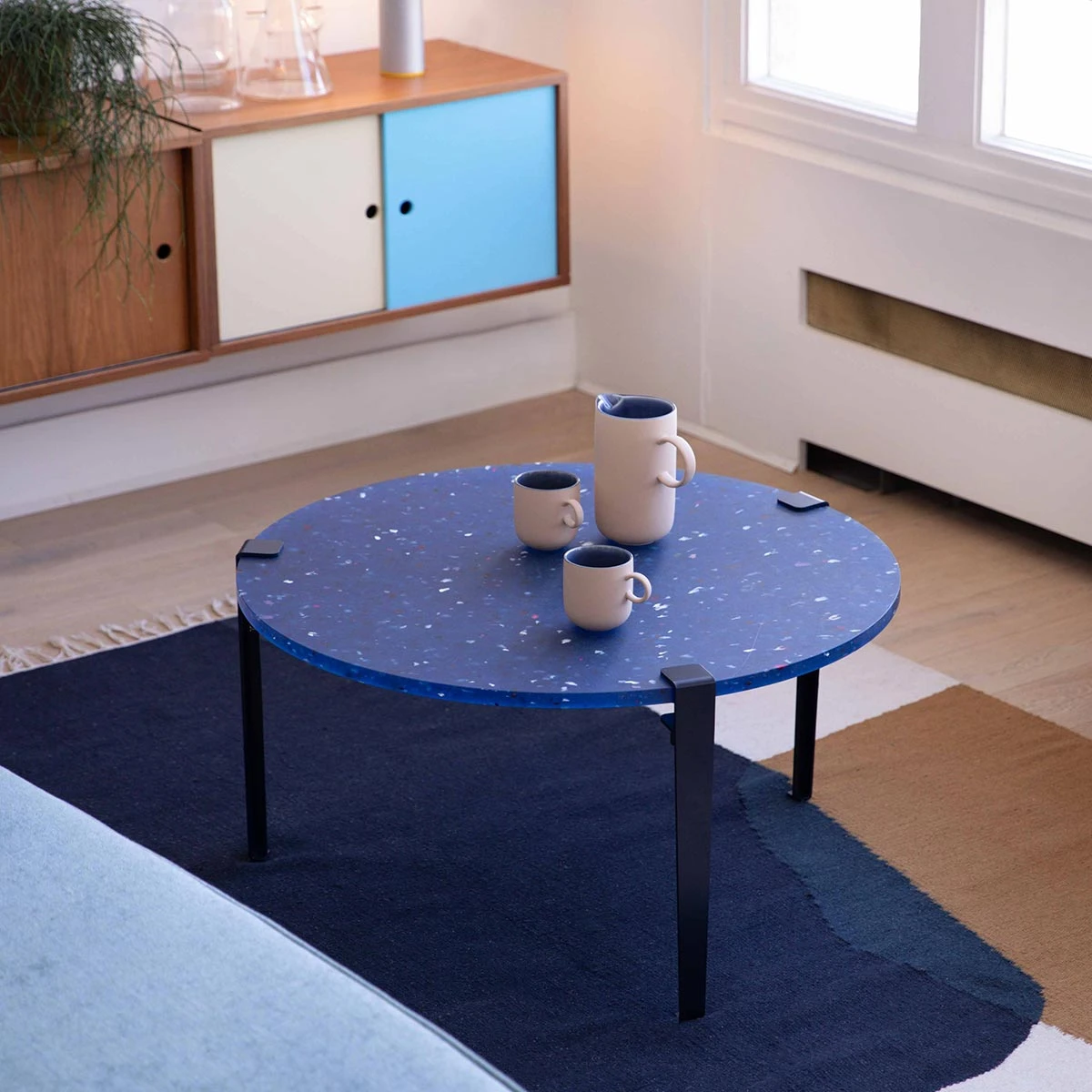 Niedriger Tisch mit 3 TIPTOE 43 cm Beinen und einer runden Tischplatte mit Ø 80 cm, hergestellt aus 100% recycletem und recyclebarem Plastik – ja, diese Tischplatte war im ersten Leben ein ganzer Haufen PET-Verpackungen.