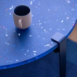 Die Tischplatte PACIFICO wird aus alten PET-Verpackungen hergestellt. Der gesammelte Plastikmüll wird zu Chips verarbeitet und dann gepresst – ganz ohne Bindemittel. Die Farbstippsen stammen von den Etikettenfragmenten – ein kleiner Hinweis auf die frühere Inkarnation. Das Blau ist ganz leicht Transluzent, was einen ganz besondere Anmutung mit sich bringt. Jeder PACIFICO-Tisch ist ein Unikat und hat eine eigene, individuelle Geschichte aus Kunststoff.