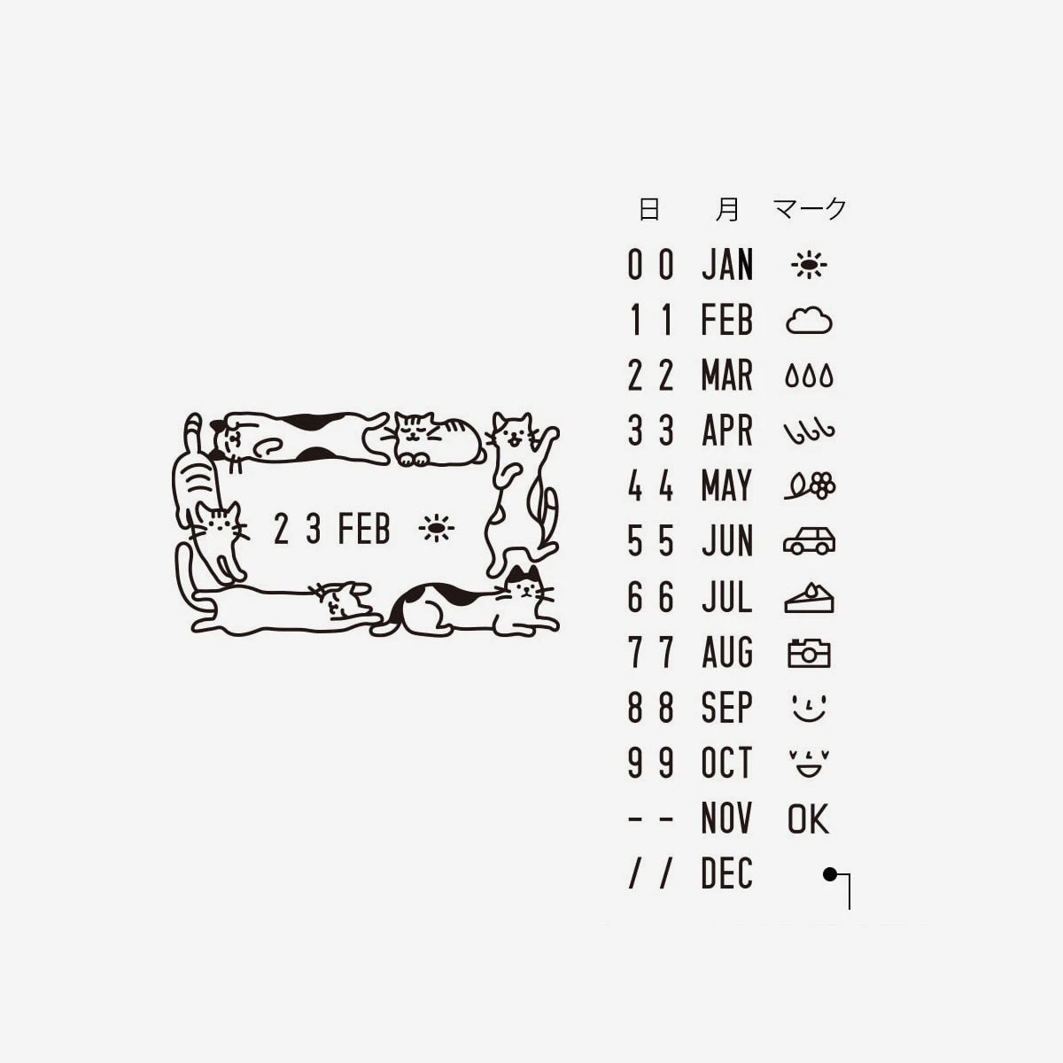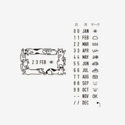 Das clevere Drehrad ermöglicht nicht nur das einfache Einstellen von Datum, sondern auch von Wetter-Symbolen und witzigen Icons. Ein Feld bleibt leer, damit du eigene kleine Zeichnungen hinzufügen kannst. Umrahmt wird das Ganze von charmanten Katzen-Illustrationen, die jedem Planer, Tagebuch oder Brief das gewisse Etwas verleihen. Ein verspieltes Must-have für alle, die Funktionalität und Kreativität verbinden möchten!