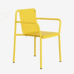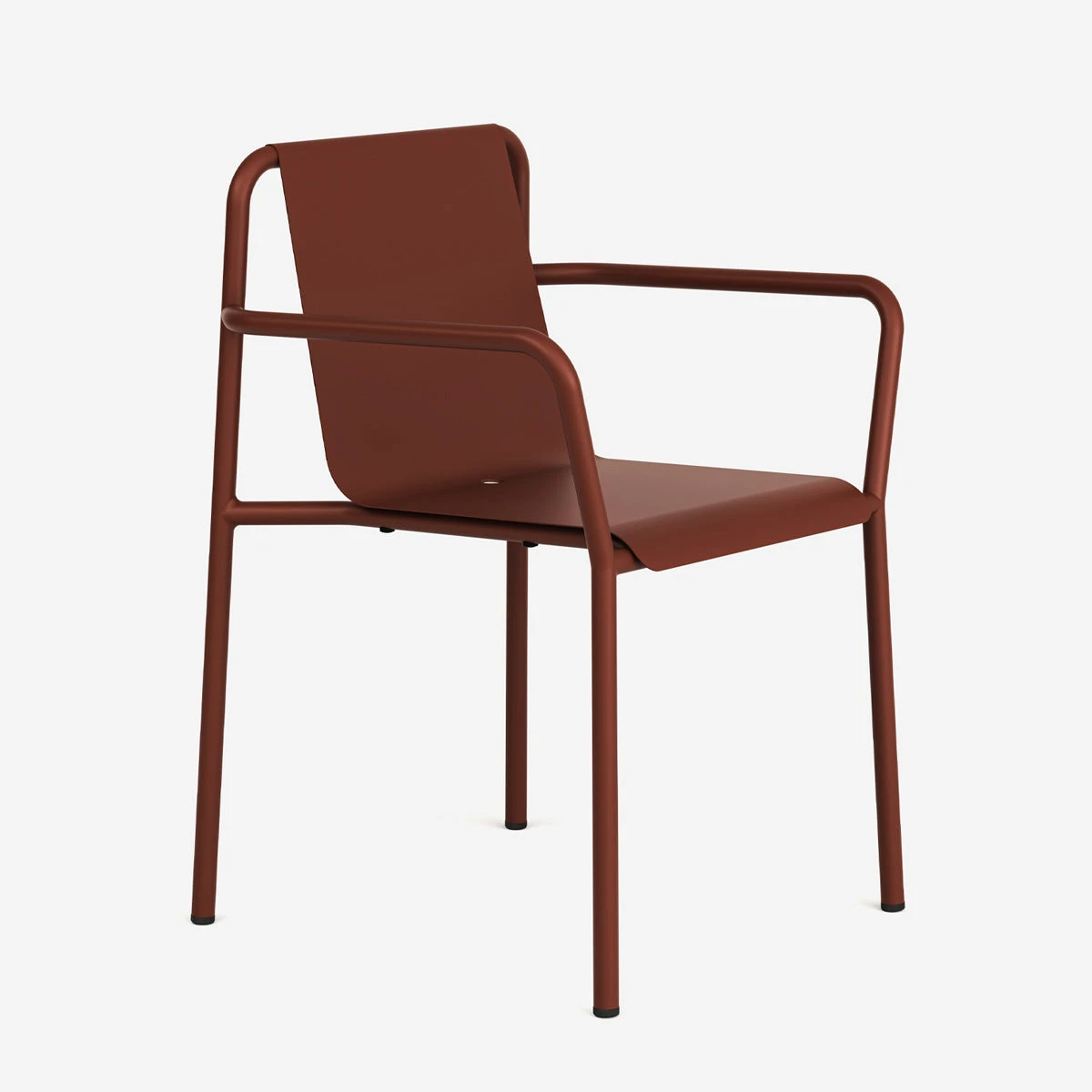 Gefertigt aus pulverbeschichtetem, gebogenem Stahlblech, bringt der Stuhl eine gewisse Leichtigkeit mit – sowohl optisch als auch im Alltag. Die geschwungene Sitzfläche, die perforierten Details und die dezente Rundung der Lehnen sorgen für einen angenehmen Sitzkomfort, ohne aufdringlich zu wirken.