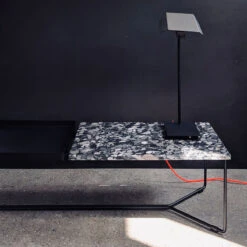 Der POI Table Double ist ein Couchtisch mit einem Gestell aus Rundstahl, dass von Hand gebogen wird. Es besteht aus zwei identischen Teilen, die sich spiegeln und miteinander verschweißt werden. Das Tablett und die Nero Marinace Steinplatte werden unsichtbar auf dem Gestell befestigt. Der außergewöhnliche Stein Nero Marinace zählt zu der Gruppe der Granite und ist ein über Jahrtausende versteinertes Flussbett. Von dem farblich gleichmäßigen Hintergrund heben sich unzählige Kiesel in allen möglichen Nuancen und Formen ab. Marinace ist sehr hart – sogar härter als Granit – und ebenso witterungsresistent.