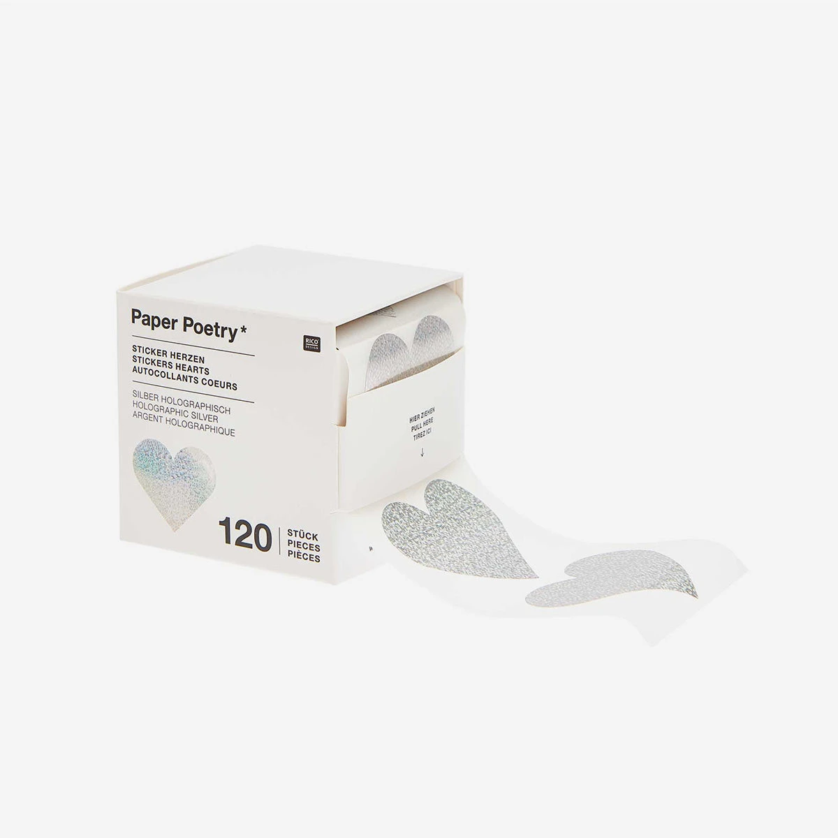 Mit den 120 holografisch-silbernen Herz-Stickern auf der Rolle kannst du so ziemlich alles verzieren, was dir in die Finger kommt: Geschenke, Weihnachtspost, Notizbücher, Adventskalender, Einladungen, und jede Bastelei.