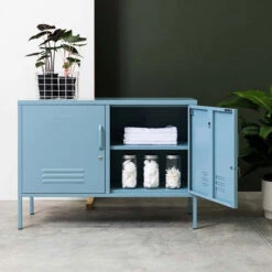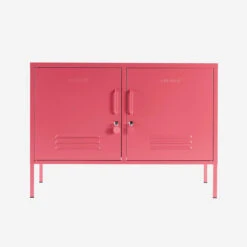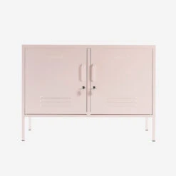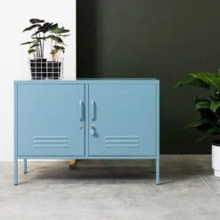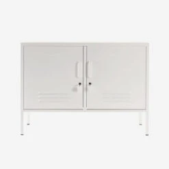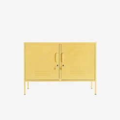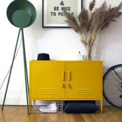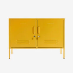 Der Lowdown hat einen frei einsetzbaren Boden und zwei Haken innen in der Tür. Es gibt einen Kabelauslass und Löcher an der Rückwand, um ihn bei Bedarf an der Wand zu sichern. Der Lowdown hat außerdem Lüftungsschlitze und ist abschließbar: es gibt zwei Schlüssel mit einem hübschen mustard-Schlüsselanhänger.