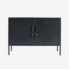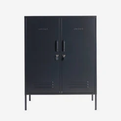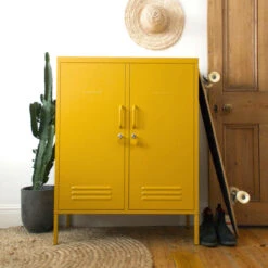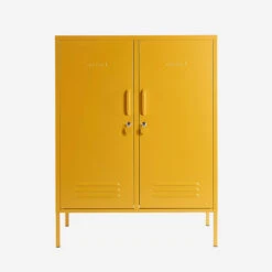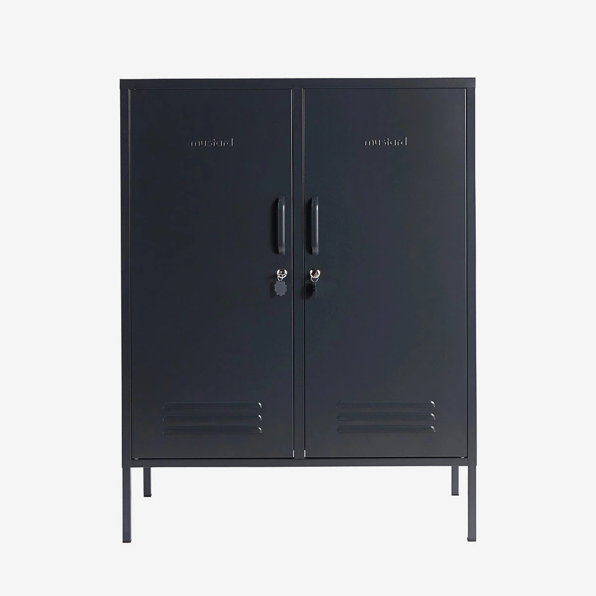 Der Midi hat zwei frei einsetzbare Böden. Innen in der Tür sind zwei Haken. Es gibt einen Kabelauslass, und die Rückwand hat außerdem Löcher, um ihn bei Bedarf an der Wand zu sichern. Der Midi hat Lüftungsschlitze und ist abschließbar: es gibt zwei Schlüssel mit einem hübschen mustard-Schlüsselanhänger.
