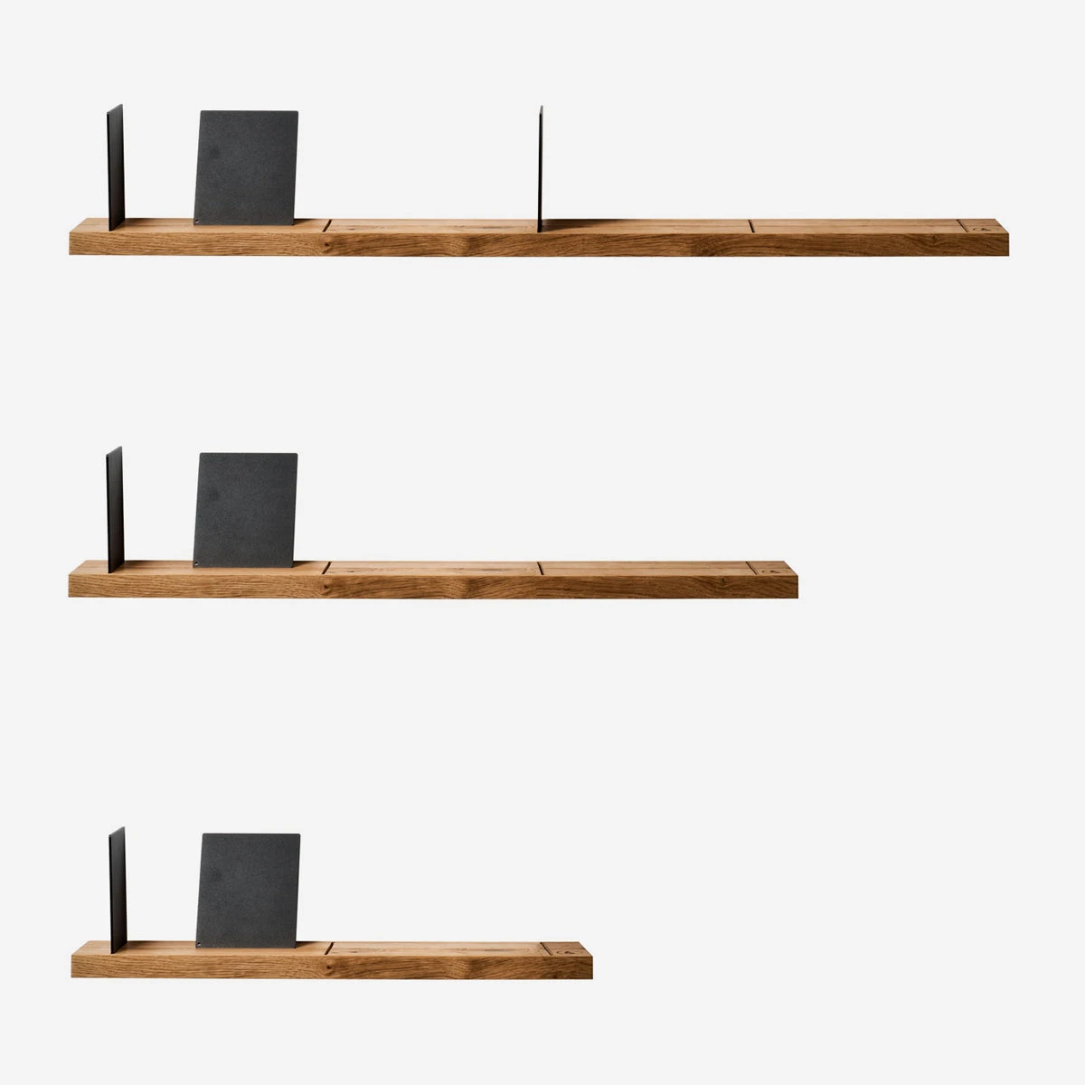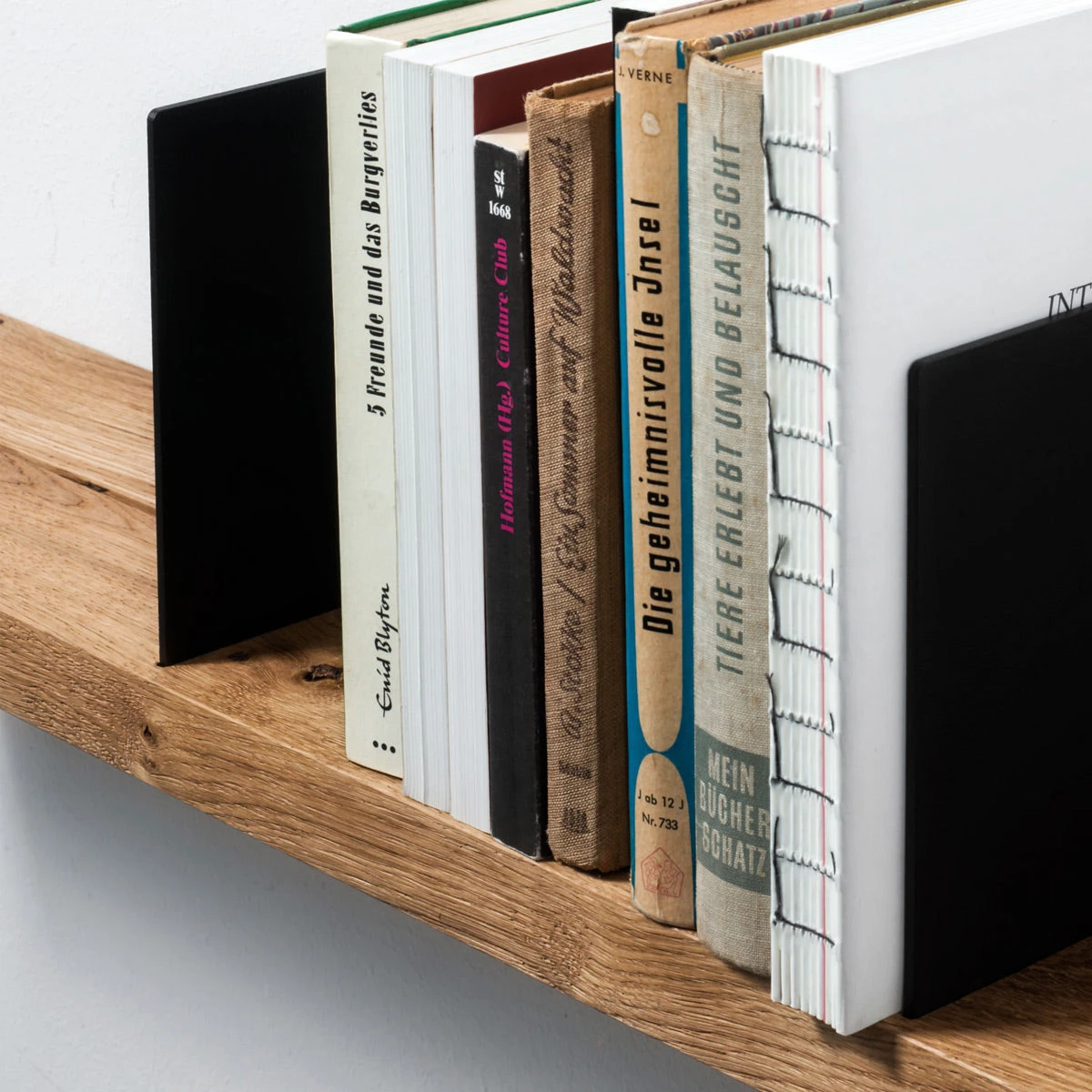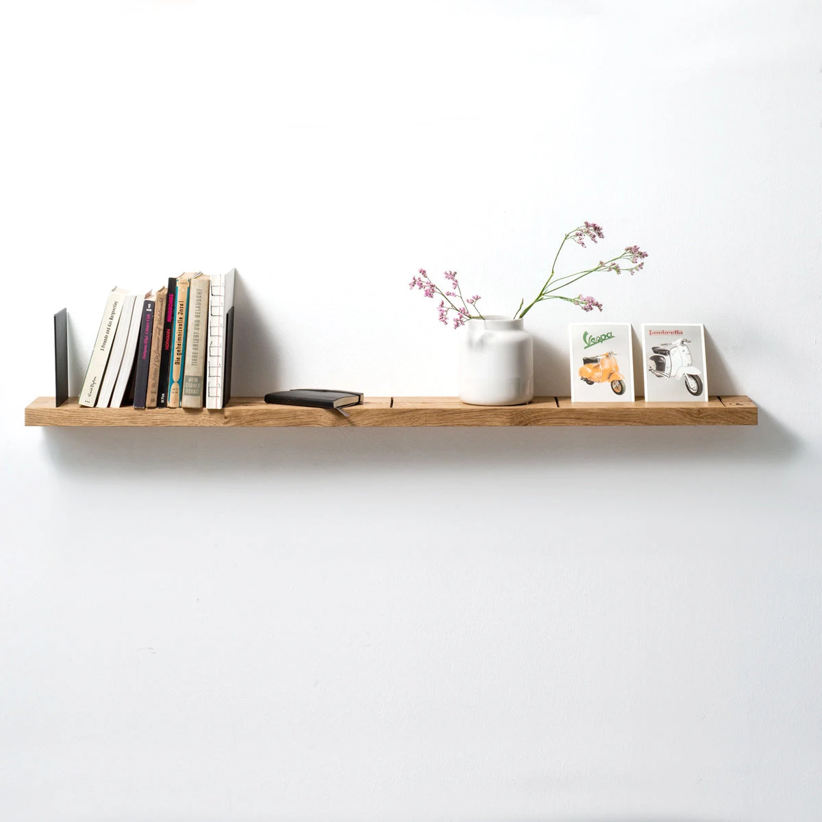Das tolle Wandregal aus massivem Eichenholz hat waagerecht und senkrecht gefräste Nuten, in denen man die beiden mitgelieferten Buchstützen aus pulverbeschichtetem Stahl platzieren kann. Auch Bilder, Lieblingsfotos und Postkarten finden in der Nut sicheren Halt.
