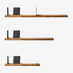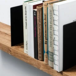 Zum Lieferumfang gehören das Regal, pulverbeschichtete Metallbuchstützen (S und M mit 2 Buchstützen, L mit 3 Buchstützen) und Befestigungsmaterial.