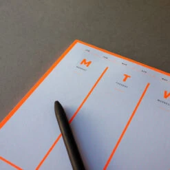 Dieser zeitlose Wochenplaner mit Neon-Orange geht auf dem Schreibtisch sicher nicht unter. Für jede Woche gibt es ein Blatt, die Monate und Tage können von Hand markiert bzw. eingetragen werden. Für zusätzliche Notizen gibt es noch Platz auf einem extra Feld.